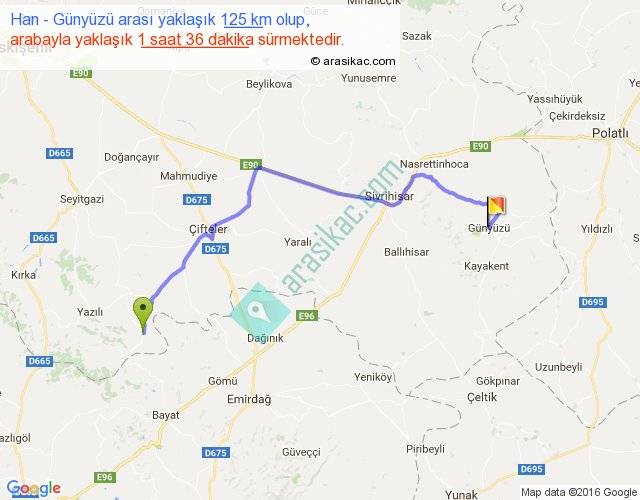 Han - Günyüzü arası yaklaşık olarak 90 km/h ile yukarıda belirtilen sürede olup, iki yerin kuş uçuşu uzaklığı (mesafesi) 85'dir. Yolculuk otobüsle 2 saat 4 dakika sürmektedir.