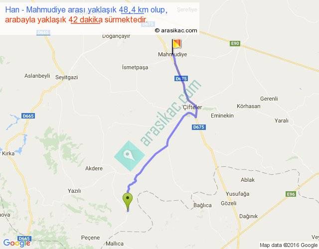 Han - Mahmudiye arası yaklaşık olarak 90 km/h ile yukarıda belirtilen sürede olup, iki yerin kuş uçuşu uzaklığı (mesafesi) 38'dir. Yolculuk otobüsle 54 dakika sürmektedir.