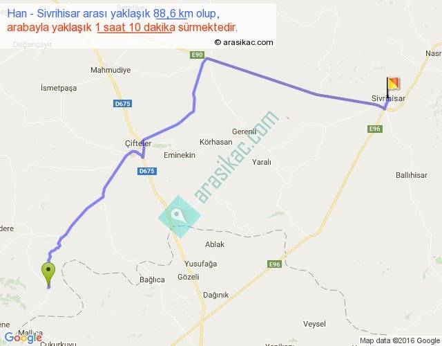 Han - Sivrihisar arası yaklaşık olarak 90 km/h ile yukarıda belirtilen sürede olup, iki yerin kuş uçuşu uzaklığı (mesafesi) 66'dir. Yolculuk otobüsle 1 saat 31 dakika sürmektedir.