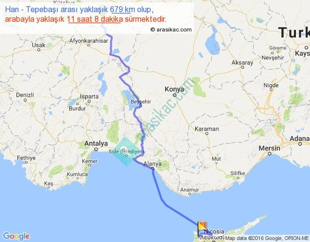 Han - Tepebaşı arası yaklaşık olarak 90 km/h ile yukarıda belirtilen sürede olup, iki yerin kuş uçuşu uzaklığı (mesafesi) 468'dir. Eğer belirtilen yerler arasında uçak seferi var ise bu süre uçakla 43 dakika'ya kadar düşebilir. Yolculuk otobüsle 14 saat 28 dakika sürmektedir.