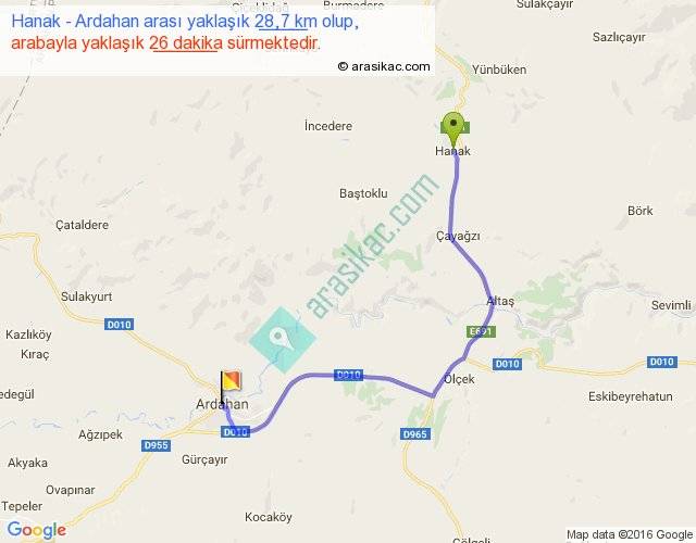 Hanak - Ardahan arası yaklaşık olarak 90 km/h ile yukarıda belirtilen sürede olup, iki yerin kuş uçuşu uzaklığı (mesafesi) 18'dir. Yolculuk otobüsle 33 dakika sürmektedir.