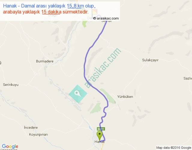 Hanak - Damal arası yaklaşık olarak 90 km/h ile yukarıda belirtilen sürede olup, iki yerin kuş uçuşu uzaklığı (mesafesi) 12'dir. Yolculuk otobüsle 19 dakika sürmektedir.