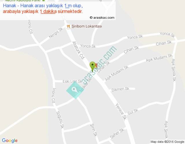 Hanak - Hanak arası yaklaşık olarak 90 km/h ile yukarıda belirtilen sürede olup, iki yerin kuş uçuşu uzaklığı (mesafesi) 0'dir. Yolculuk otobüsle 1 dakika sürmektedir.