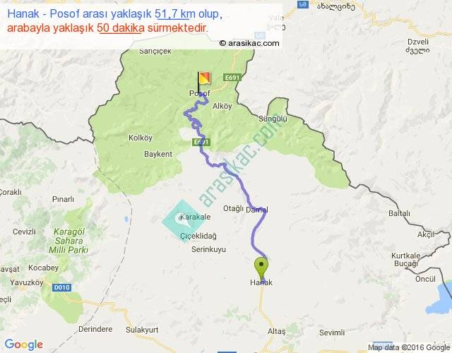 Hanak - Posof arası yaklaşık olarak 90 km/h ile yukarıda belirtilen sürede olup, iki yerin kuş uçuşu uzaklığı (mesafesi) 32'dir. Yolculuk otobüsle 1 saat 5 dakika sürmektedir.