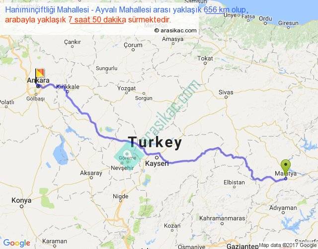 Hanımınçiftliği Mahallesi - Ayvalı Mahallesi arası yaklaşık olarak 90 km/h ile yukarıda belirtilen sürede olup, iki yerin kuş uçuşu uzaklığı (mesafesi) 505'dir. Eğer belirtilen yerler arasında uçak seferi var ise bu süre uçakla 46 dakika'ya kadar düşebilir. Yolculuk otobüsle 10 saat 11 dakika sürmektedir.