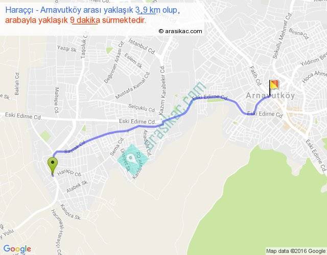 Haraççı - Arnavutköy arası yaklaşık olarak 90 km/h ile yukarıda belirtilen sürede olup, iki yerin kuş uçuşu uzaklığı (mesafesi) 3'dir. Yolculuk otobüsle 11 dakika sürmektedir.