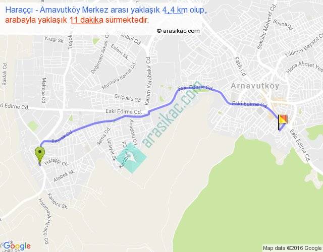 Haraççı - Arnavutköy Merkez arası yaklaşık olarak 90 km/h ile yukarıda belirtilen sürede olup, iki yerin kuş uçuşu uzaklığı (mesafesi) 3'dir. Yolculuk otobüsle 14 dakika sürmektedir.