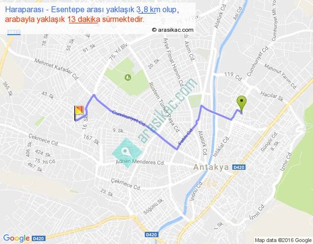 Haraparası - Esentepe arası yaklaşık olarak 90 km/h ile yukarıda belirtilen sürede olup, iki yerin kuş uçuşu uzaklığı (mesafesi) 3'dir. Yolculuk otobüsle 16 dakika sürmektedir.