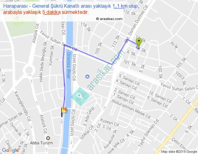 Haraparası - General Şükrü Kanatlı arası yaklaşık olarak 90 km/h ile yukarıda belirtilen sürede olup, iki yerin kuş uçuşu uzaklığı (mesafesi) 1'dir. Yolculuk otobüsle 6 dakika sürmektedir.