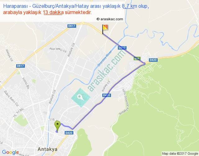 Haraparası - Güzelburç Antakya Hatay arası yaklaşık olarak 90 km/h ile yukarıda belirtilen sürede olup, iki yerin kuş uçuşu uzaklığı (mesafesi) 5'dir. Yolculuk otobüsle 16 dakika sürmektedir.