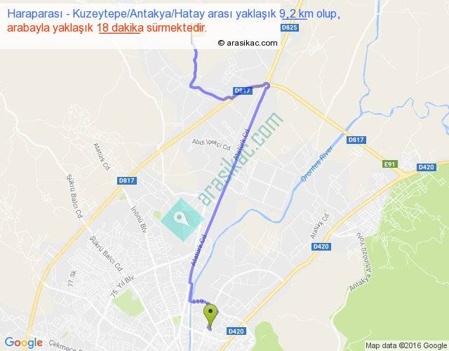 Haraparası - Kuzeytepe Antakya Hatay arası yaklaşık olarak 90 km/h ile yukarıda belirtilen sürede olup, iki yerin kuş uçuşu uzaklığı (mesafesi) 6'dir. Yolculuk otobüsle 23 dakika sürmektedir.