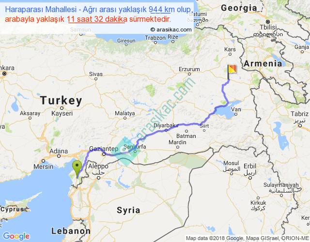 Haraparası Mahallesi - Ağrı arası yaklaşık olarak 90 km/h ile yukarıda belirtilen sürede olup, iki yerin kuş uçuşu uzaklığı (mesafesi) 714'dir. Eğer belirtilen yerler arasında uçak seferi var ise bu süre uçakla 1 saat 05 dakika'ya kadar düşebilir. Yolculuk otobüsle 14 saat 59 dakika sürmektedir.