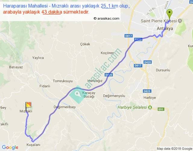 Haraparası Mahallesi - Mızraklı arası yaklaşık olarak 90 km/h ile yukarıda belirtilen sürede olup, iki yerin kuş uçuşu uzaklığı (mesafesi) 17'dir. Yolculuk otobüsle 55 dakika sürmektedir.
