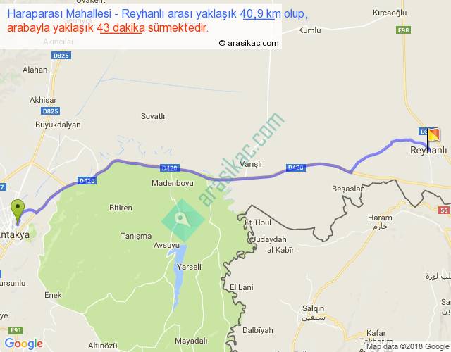 Haraparası Mahallesi - Reyhanlı arası yaklaşık olarak 90 km/h ile yukarıda belirtilen sürede olup, iki yerin kuş uçuşu uzaklığı (mesafesi) 36'dir. Yolculuk otobüsle 55 dakika sürmektedir.