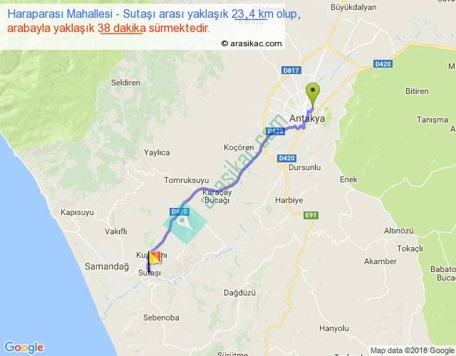 Haraparası Mahallesi - Sutaşı arası yaklaşık olarak 90 km/h ile yukarıda belirtilen sürede olup, iki yerin kuş uçuşu uzaklığı (mesafesi) 20'dir. Yolculuk otobüsle 49 dakika sürmektedir.