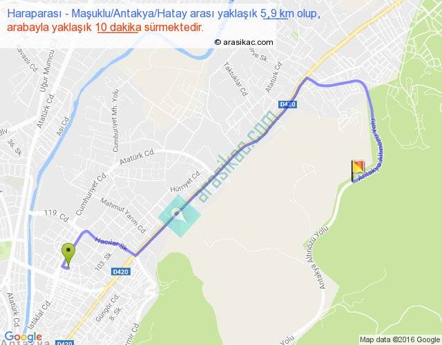 Haraparası - Maşuklu Antakya Hatay arası yaklaşık olarak 90 km/h ile yukarıda belirtilen sürede olup, iki yerin kuş uçuşu uzaklığı (mesafesi) 3'dir. Yolculuk otobüsle 13 dakika sürmektedir.