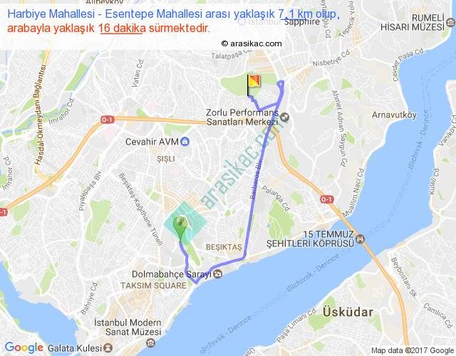 Harbiye Mahallesi - Esentepe Mahallesi arası yaklaşık olarak 90 km/h ile yukarıda belirtilen sürede olup, iki yerin kuş uçuşu uzaklığı (mesafesi) 3'dir. Yolculuk otobüsle 20 dakika sürmektedir.