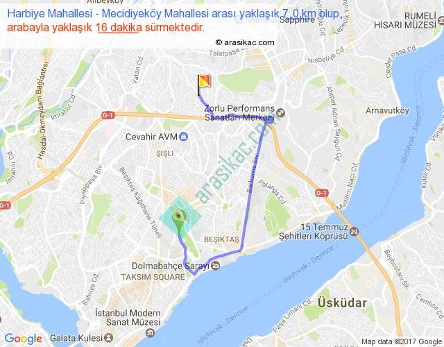 Harbiye Mahallesi - Mecidiyeköy Mahallesi arası yaklaşık olarak 90 km/h ile yukarıda belirtilen sürede olup, iki yerin kuş uçuşu uzaklığı (mesafesi) 3'dir. Yolculuk otobüsle 20 dakika sürmektedir.