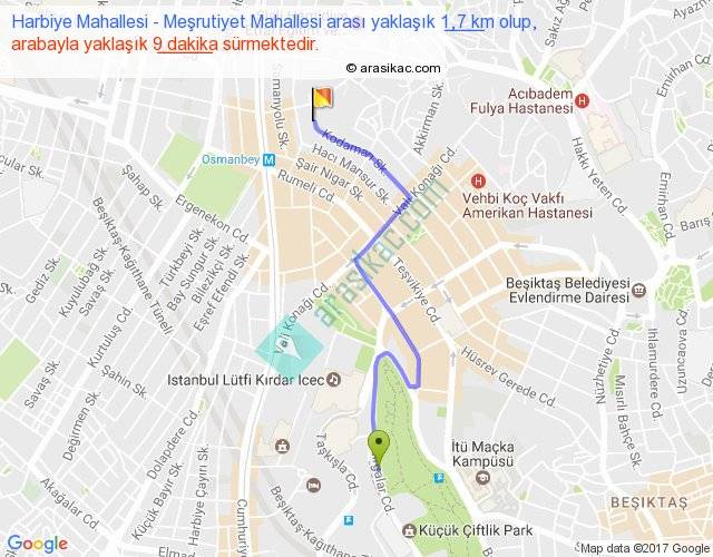Harbiye Mahallesi - Meşrutiyet Mahallesi arası yaklaşık olarak 90 km/h ile yukarıda belirtilen sürede olup, iki yerin kuş uçuşu uzaklığı (mesafesi) 1'dir. Yolculuk otobüsle 11 dakika sürmektedir.