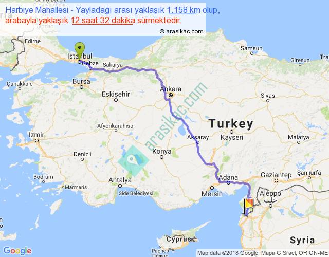 Harbiye Mahallesi - Yayladağı arası yaklaşık olarak 90 km/h ile yukarıda belirtilen sürede olup, iki yerin kuş uçuşu uzaklığı (mesafesi) 835'dir. Eğer belirtilen yerler arasında uçak seferi var ise bu süre uçakla 1 saat 17 dakika'ya kadar düşebilir. Yolculuk otobüsle 16 saat 17 dakika sürmektedir.