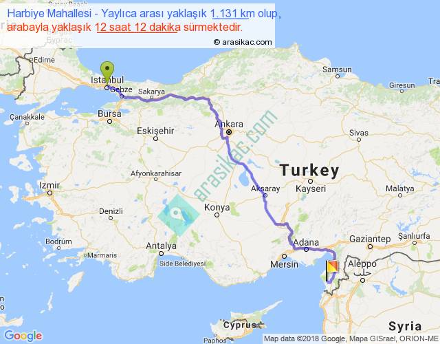 Harbiye Mahallesi - Yaylıca arası yaklaşık olarak 90 km/h ile yukarıda belirtilen sürede olup, iki yerin kuş uçuşu uzaklığı (mesafesi) 811'dir. Eğer belirtilen yerler arasında uçak seferi var ise bu süre uçakla 1 saat 14 dakika'ya kadar düşebilir. Yolculuk otobüsle 15 saat 51 dakika sürmektedir.
