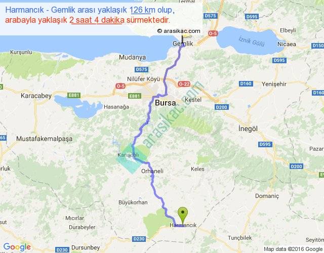 Harmancık - Gemlik arası yaklaşık olarak 90 km/h ile yukarıda belirtilen sürede olup, iki yerin kuş uçuşu uzaklığı (mesafesi) 83'dir. Yolculuk otobüsle 2 saat 41 dakika sürmektedir.