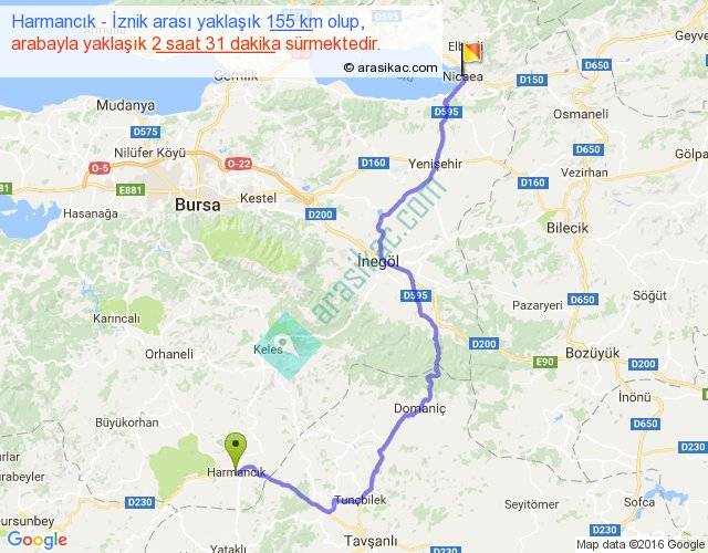 Harmancık - İznik arası yaklaşık olarak 90 km/h ile yukarıda belirtilen sürede olup, iki yerin kuş uçuşu uzaklığı (mesafesi) 96'dir. Yolculuk otobüsle 3 saat 16 dakika sürmektedir.