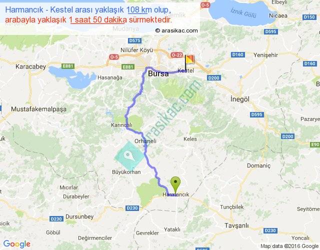 Harmancık - Kestel arası yaklaşık olarak 90 km/h ile yukarıda belirtilen sürede olup, iki yerin kuş uçuşu uzaklığı (mesafesi) 58'dir. Yolculuk otobüsle 2 saat 23 dakika sürmektedir.