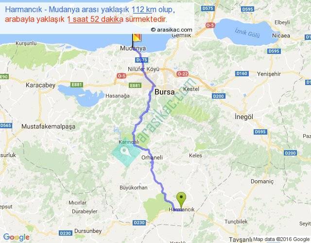 Harmancık - Mudanya arası yaklaşık olarak 90 km/h ile yukarıda belirtilen sürede olup, iki yerin kuş uçuşu uzaklığı (mesafesi) 81'dir. Yolculuk otobüsle 2 saat 25 dakika sürmektedir.