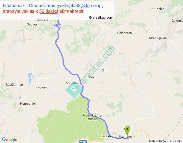 Harmancık - Orhaneli arası yaklaşık olarak 90 km/h ile yukarıda belirtilen sürede olup, iki yerin kuş uçuşu uzaklığı (mesafesi) 29'dir. Yolculuk otobüsle 50 dakika sürmektedir.