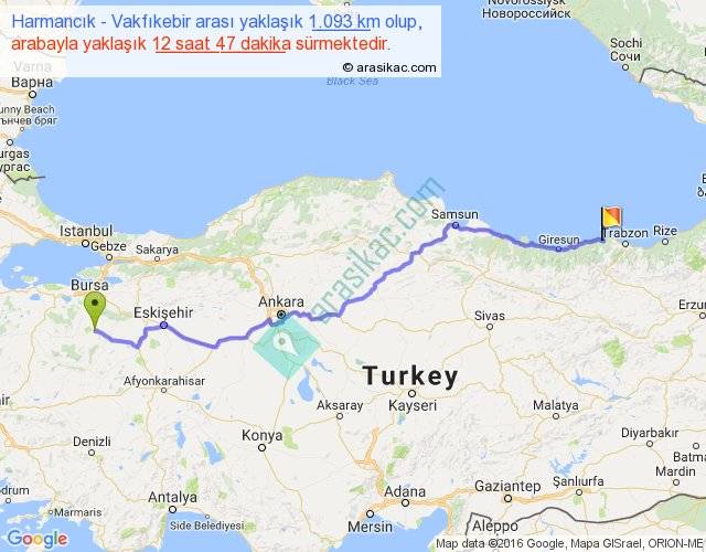 Harmancık - Vakfıkebir arası yaklaşık olarak 90 km/h ile yukarıda belirtilen sürede olup, iki yerin kuş uçuşu uzaklığı (mesafesi) 865'dir. Eğer belirtilen yerler arasında uçak seferi var ise bu süre uçakla 1 saat 19 dakika'ya kadar düşebilir. Yolculuk otobüsle 16 saat 37 dakika sürmektedir.