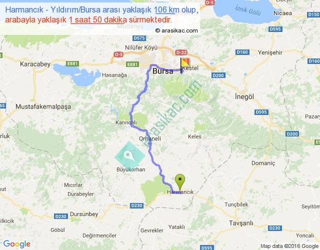 Harmancık - Yıldırım Bursa arası yaklaşık olarak 90 km/h ile yukarıda belirtilen sürede olup, iki yerin kuş uçuşu uzaklığı (mesafesi) 55'dir. Yolculuk otobüsle 2 saat 23 dakika sürmektedir.