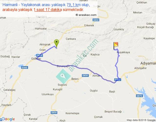 Harmanli - Yaylakonak arası yaklaşık olarak 90 km/h ile yukarıda belirtilen sürede olup, iki yerin kuş uçuşu uzaklığı (mesafesi) 28'dir. Yolculuk otobüsle 1 saat 40 dakika sürmektedir.
