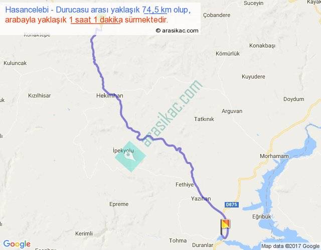 Hasancelebi - Durucasu arası yaklaşık olarak 90 km/h ile yukarıda belirtilen sürede olup, iki yerin kuş uçuşu uzaklığı (mesafesi) 56'dir. Yolculuk otobüsle 1 saat 19 dakika sürmektedir.