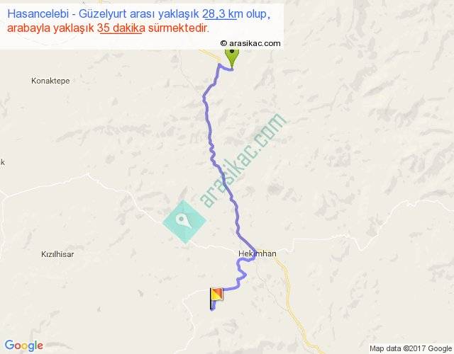 Hasancelebi - Güzelyurt arası yaklaşık olarak 90 km/h ile yukarıda belirtilen sürede olup, iki yerin kuş uçuşu uzaklığı (mesafesi) 20'dir. Yolculuk otobüsle 45 dakika sürmektedir.