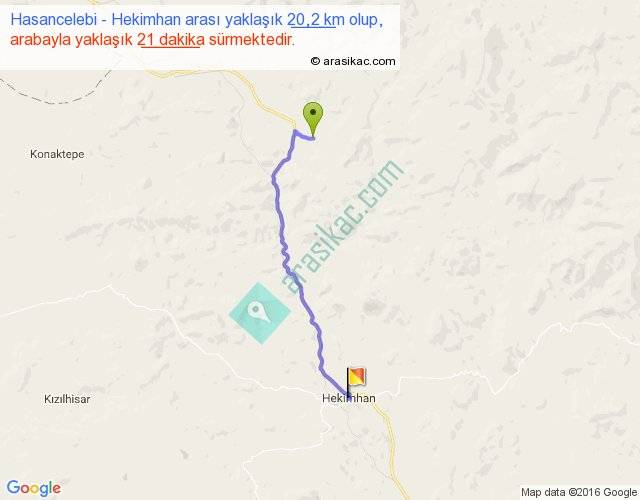 Hasancelebi - Hekimhan arası yaklaşık olarak 90 km/h ile yukarıda belirtilen sürede olup, iki yerin kuş uçuşu uzaklığı (mesafesi) 16'dir. Yolculuk otobüsle 27 dakika sürmektedir.
