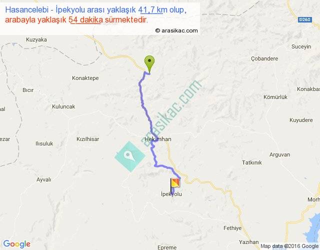 Hasancelebi - İpekyolu arası yaklaşık olarak 90 km/h ile yukarıda belirtilen sürede olup, iki yerin kuş uçuşu uzaklığı (mesafesi) 29'dir. Yolculuk otobüsle 1 saat 10 dakika sürmektedir.