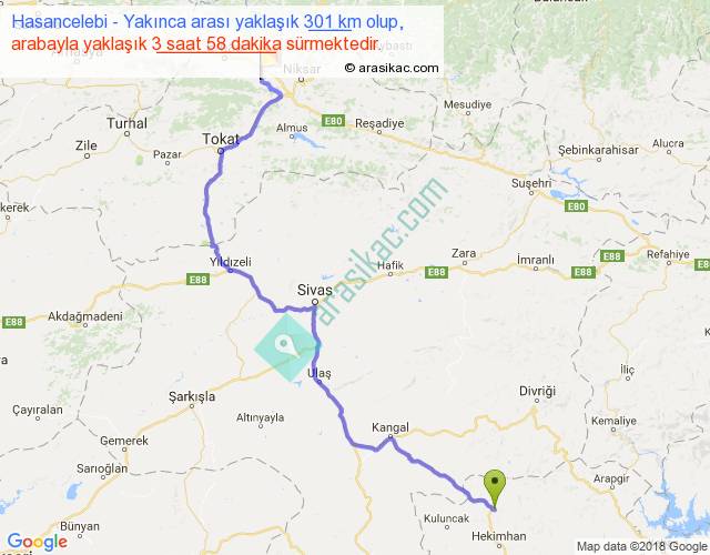 Hasancelebi - Yakınca arası yaklaşık olarak 90 km/h ile yukarıda belirtilen sürede olup, iki yerin kuş uçuşu uzaklığı (mesafesi) 205'dir. Yolculuk otobüsle 5 saat 9 dakika sürmektedir.
