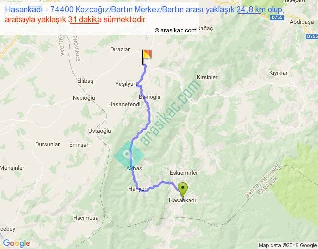 Hasankadı - 74400 Kozcağız Bartın Merkez Bartın arası yaklaşık olarak 90 km/h ile yukarıda belirtilen sürede olup, iki yerin kuş uçuşu uzaklığı (mesafesi) 16'dir. Yolculuk otobüsle 40 dakika sürmektedir.