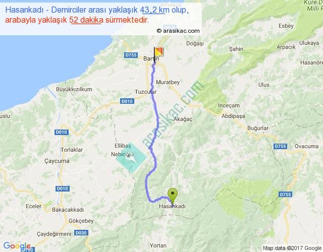 Hasankadı - Demirciler arası yaklaşık olarak 90 km/h ile yukarıda belirtilen sürede olup, iki yerin kuş uçuşu uzaklığı (mesafesi) 33'dir. Yolculuk otobüsle 1 saat 7 dakika sürmektedir.