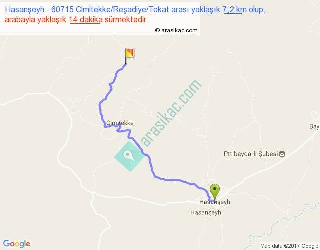 Hasanşeyh - 60715 Cimitekke Reşadiye Tokat arası yaklaşık olarak 90 km/h ile yukarıda belirtilen sürede olup, iki yerin kuş uçuşu uzaklığı (mesafesi) 5'dir. Yolculuk otobüsle 18 dakika sürmektedir.