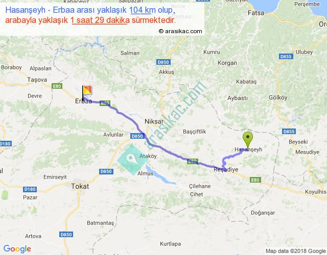 Hasanşeyh - Erbaa arası yaklaşık olarak 90 km/h ile yukarıda belirtilen sürede olup, iki yerin kuş uçuşu uzaklığı (mesafesi) 77'dir. Yolculuk otobüsle 1 saat 55 dakika sürmektedir.