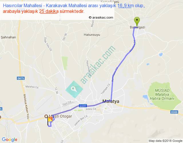 Hasırcılar Mahallesi - Karakavak Mahallesi arası yaklaşık olarak 90 km/h ile yukarıda belirtilen sürede olup, iki yerin kuş uçuşu uzaklığı (mesafesi) 14'dir. Yolculuk otobüsle 32 dakika sürmektedir.