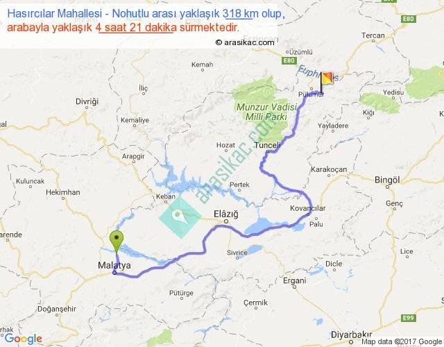 Hasırcılar Mahallesi - Nohutlu arası yaklaşık olarak 90 km/h ile yukarıda belirtilen sürede olup, iki yerin kuş uçuşu uzaklığı (mesafesi) 178'dir. Yolculuk otobüsle 5 saat 39 dakika sürmektedir.