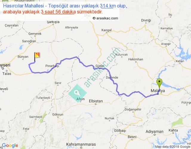 Hasırcılar Mahallesi - Topsöğüt arası yaklaşık olarak 90 km/h ile yukarıda belirtilen sürede olup, iki yerin kuş uçuşu uzaklığı (mesafesi) 203'dir. Yolculuk otobüsle 5 saat 6 dakika sürmektedir.