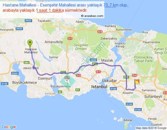 Hastane Mahallesi - Esenşehir Mahallesi arası yaklaşık olarak 90 km/h ile yukarıda belirtilen sürede olup, iki yerin kuş uçuşu uzaklığı (mesafesi) 49'dir. Yolculuk otobüsle 1 saat 19 dakika sürmektedir.