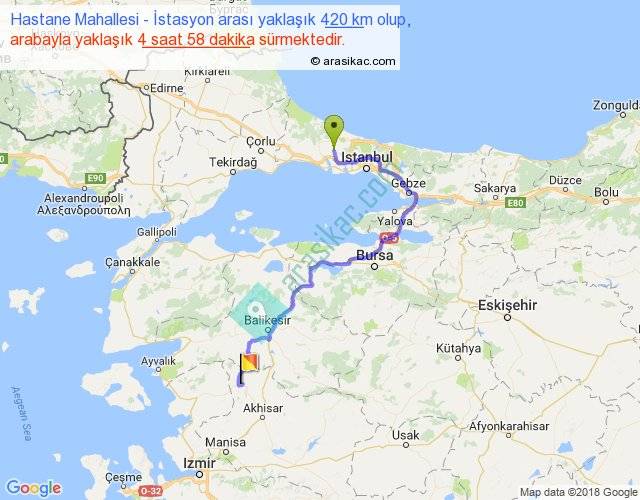 Hastane Mahallesi - İstasyon arası yaklaşık olarak 90 km/h ile yukarıda belirtilen sürede olup, iki yerin kuş uçuşu uzaklığı (mesafesi) 232'dir. Yolculuk otobüsle 6 saat 27 dakika sürmektedir.