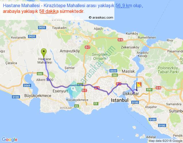 Hastane Mahallesi - Kirazlıtepe Mahallesi arası yaklaşık olarak 90 km/h ile yukarıda belirtilen sürede olup, iki yerin kuş uçuşu uzaklığı (mesafesi) 39'dir. Yolculuk otobüsle 1 saat 15 dakika sürmektedir.