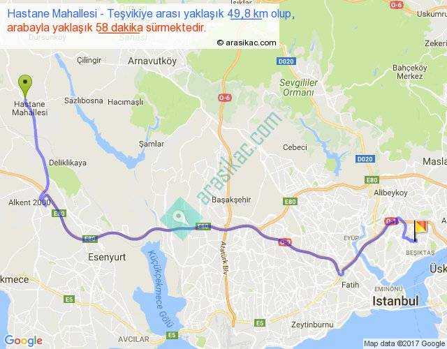Hastane Mahallesi - Teşvikiye arası yaklaşık olarak 90 km/h ile yukarıda belirtilen sürede olup, iki yerin kuş uçuşu uzaklığı (mesafesi) 34'dir. Yolculuk otobüsle 1 saat 15 dakika sürmektedir.