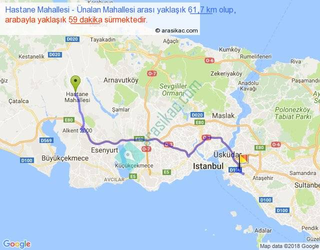 Hastane Mahallesi - Ünalan Mahallesi arası yaklaşık olarak 90 km/h ile yukarıda belirtilen sürede olup, iki yerin kuş uçuşu uzaklığı (mesafesi) 41'dir. Yolculuk otobüsle 1 saat 16 dakika sürmektedir.